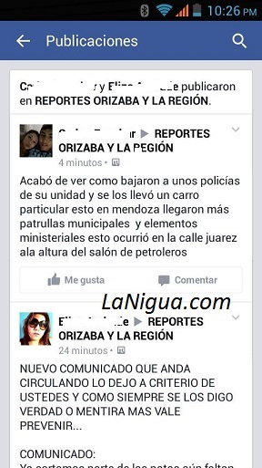 Reporta el comandante municipal Omar Escalona que al pedir novedades vía radio a la unidad "Pointer", como él identifica esa patrulla, desde las 9:20 de la noche, no recibió respuesta del Binomio por lo que salieron a buscar y ubicaron abandonada la unidad, encendida, en las Calles de Juárez y José María Neira, de Ciudad Mendoza, sin los policías Luis Oswaldo Rosales de Jesúa y Cuautle Vergara Raymundo Darío.