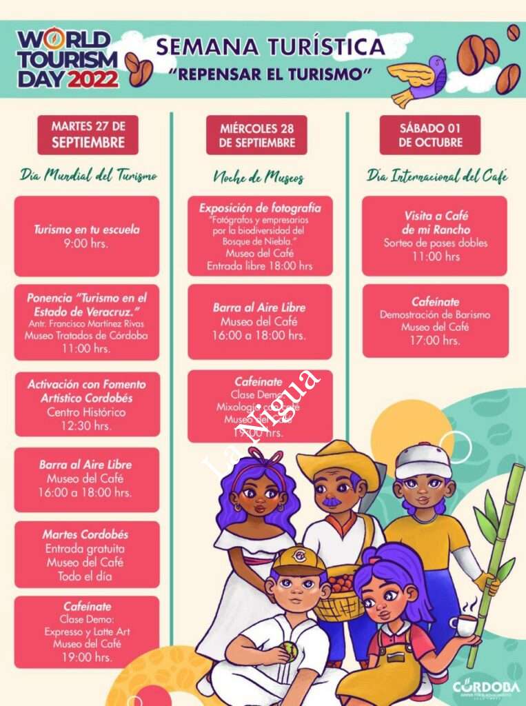 Córdoba, Ver., (26 de septiembre de 2022).- Por el Día Mundial del Turismo, la Coordinación de Turismo Municipal tiene preparado una serie de eventos desde una ponencia por el antropólogo Francisco Martínez Rivas; una activación con Fomento Artístico Cordobés; exposición fotográfica; clases demo y un sorteo de visita a Café de mi Rancho. Estas actividades son para crear conciencia en la importancia que tiene este sector sobre las riquezas del patrimonio del municipio.
