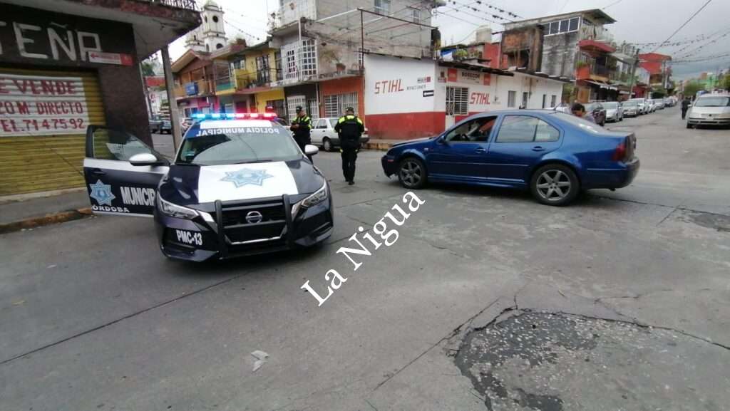Córdoba, Ver. - Solo daños materiales fue lo que dejó el percance entre una patrulla de la Policía Municipal y un vehículo Volkswagen Jetta, debido a que chocaron durante la tarde de este domingo, cuando uno de los conductores aparentemente  no respetó las indicaciones de señalamiento del 1x1 por lo que se impactaron quedando atravesados en el cruce de la avenida 10 y calle 19 del barrio de San Miguel.