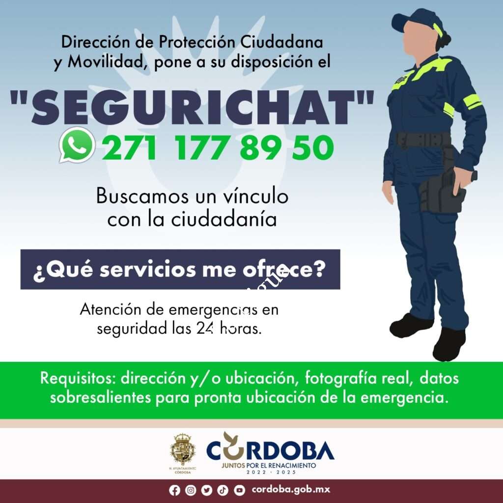 Córdoba, Ver., (08 de noviembre de 2022). – A fin de reforzar la seguridad de los cordobeses, la Dirección de Protección Ciudadana y Movilidad pone en marcha el programa: "Segurichat", en donde los ciudadanos podrán reportar a través de este número de WhatsApp 2711778950, temas de seguridad en tiempo real, a través de una fotografía y ubicación.