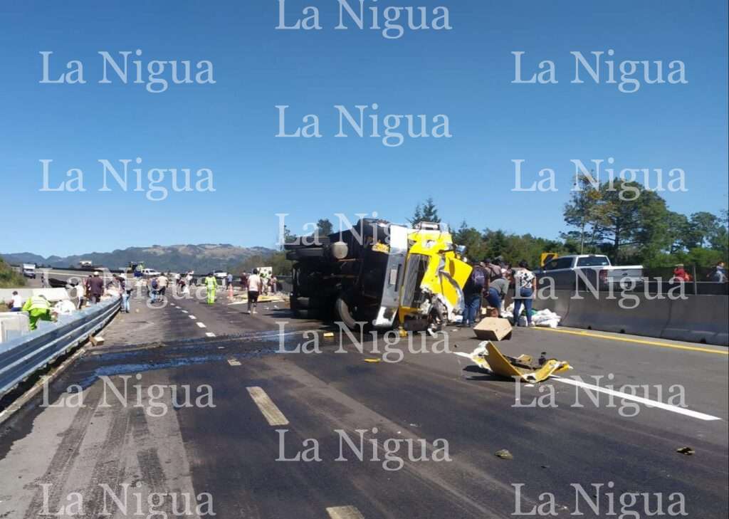 Tlcolulan, Ver.- La volcadura de un camión que transportaba abarrates, dejó como saldo una persona lesionada y daños materiales de consideración, los hechos se registraron en la autopista Xalapa-Perote, a la altura de la localidad El Fresno, municipio de Tlacolulan.